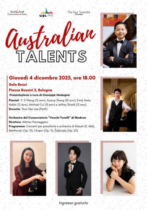 Siamo lieti di invitarvi al concerto Australian Talents, un evento speciale che vede protagonisti cinque straordinari giovani pianisti australiani, di età compresa tra i 10 e i 12 anni, in arrivo a Modena per presentare il risultato di un percorso formativo unico.