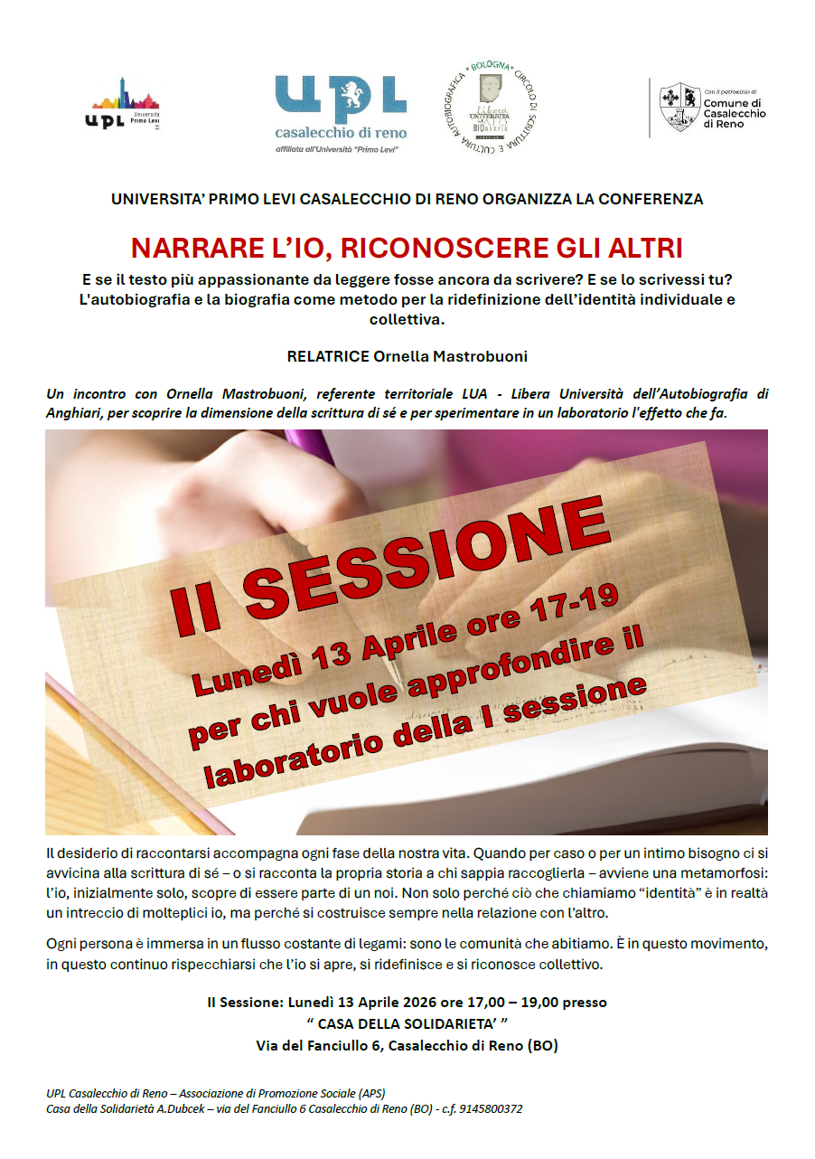 siamo lieti di invitarvi alla conferenza ‘Narrare l’io, riconoscere gli altri’, organizzata dall’Università Primo Levi di Casalecchio di Reno.
