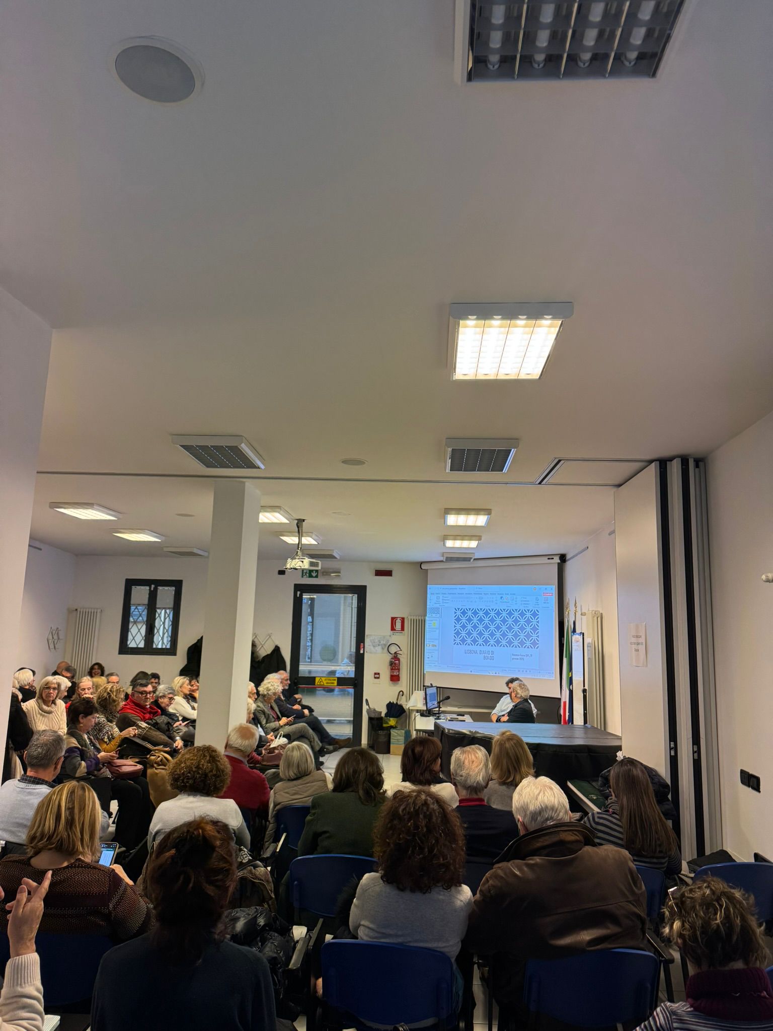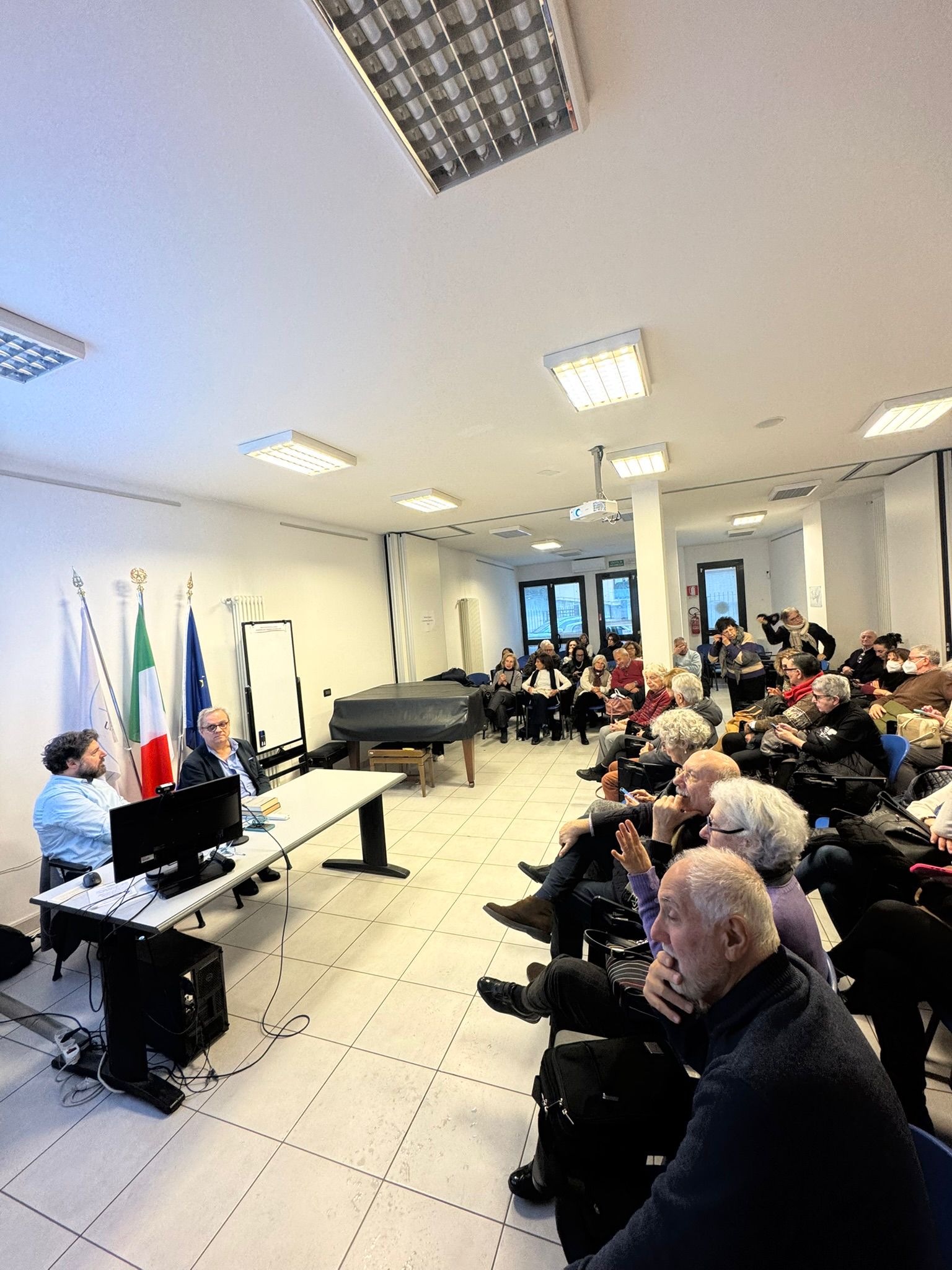 La sala era gremita di persone attente, incuriosite e coinvolte, pronte a lasciarsi trasportare da questo viaggio tra immagini, parole e musica.