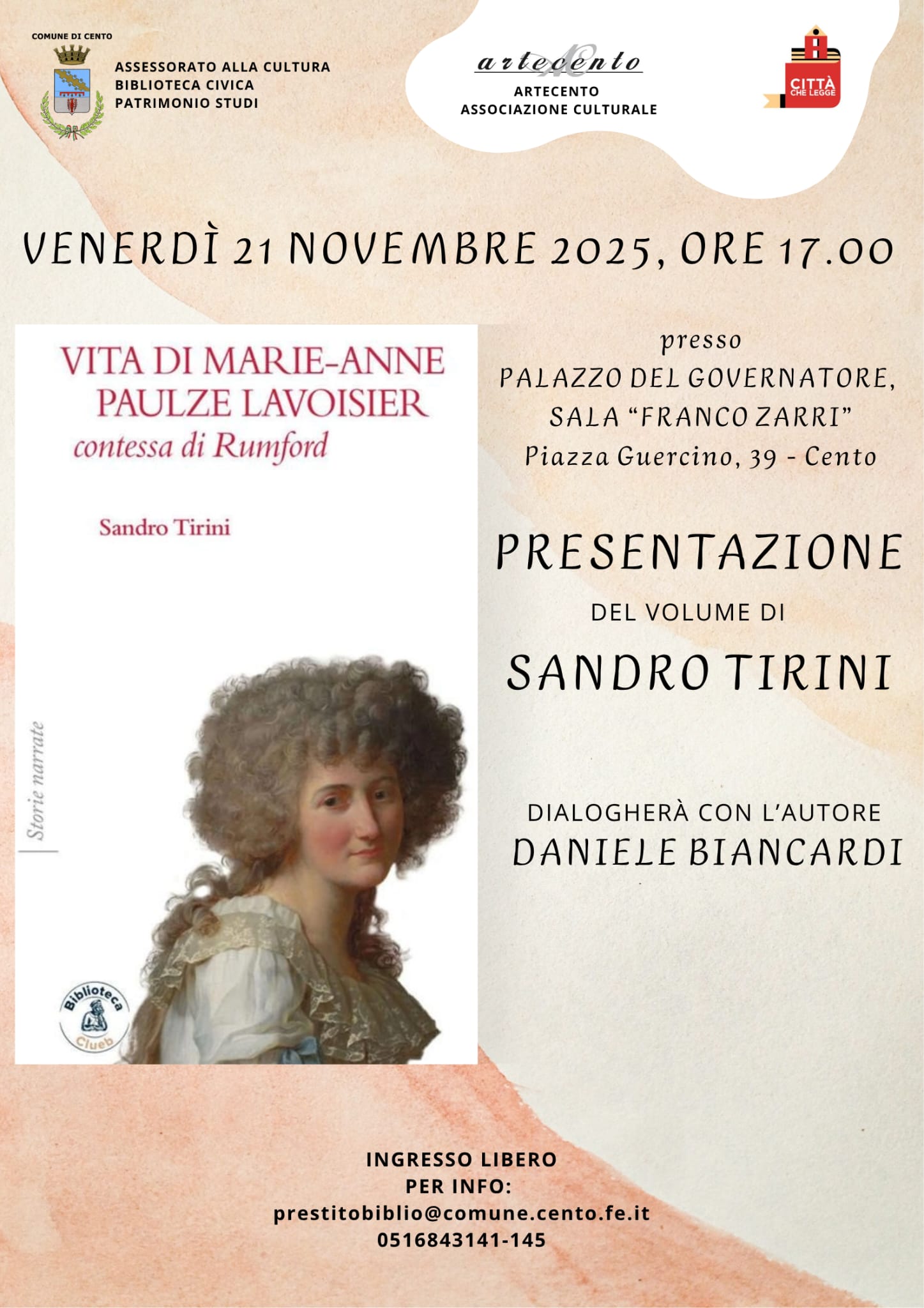 Venerdì 21 novembre 2025, alle ore 17.00, presso il Palazzo del Governatore – Sala “Franco Zarri” (Piazza Guercino, 39 – Cento), si terrà la presentazione del libro “Vita di Marie-Anne Paulze Lavoisier, contessa di Rumford” di Sandro Tirini.