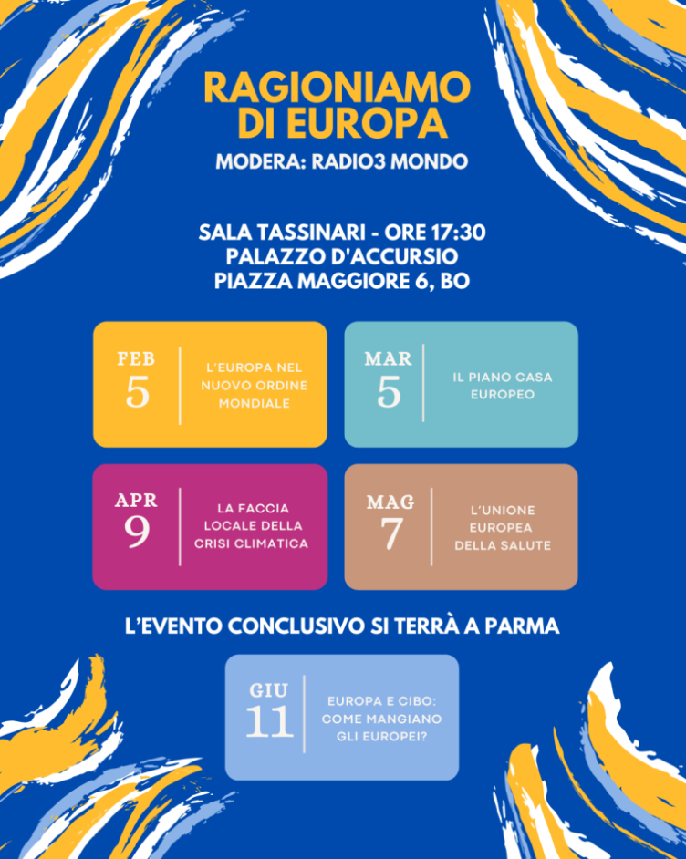 La Rassegna prevede 5 incontri che si svolgeranno a cadenza mensile. I primi quattro si svolgono in Sala Tassinari del Comune di Bologna (piazza Maggiore), dalle 17.30 alle 19.30. L’ultimo incontro, invece, è previsto a Parma (sede da definire). Saranno approfonditi alcuni tra i temi di attualità più sfidanti per l’Unione europea: il ruolo dell’Europa nella gestione delle crisi globali, l’evoluzione delle politiche sociali, la transizione ecologica, la tutela della salute e la sicurezza alimentare. Ogni appuntamento vedrà la partecipazione di studiosi, professionisti e rappresentanti istituzionali, con ampio spazio dedicato al confronto con la cittadinanza. Gli incontri saranno moderati dal team di Radio 3 Mondo.